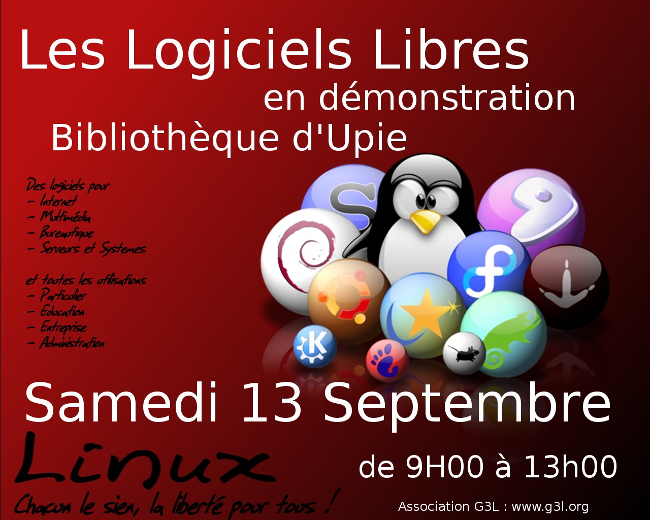 C'est sous la pluie que l'association G3L s'est déplacée ce samedi 12 septembre 2008 sur la commune d' Upie dans la Drôme, pour effectuer une présentation des logiciels libres à la bibliothèque.