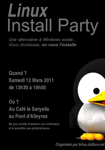 Comme chaque année Libre en fête célèbre les Logiciels Libres dans toute la France. G3L organisera pour l'occasion une journée de démonstration des logiciels Libres et d'installation de GNU/Linux à La MJC Chateauvert le Samedi 19 Mars 2011 de 10h à 18h (3 place buissonets 26000 VALENCE). Vous pourrez choisir la distribution linux de votre choix pour la faire installer gratuitement sur votre ordinateur ou profiter des logiciels libres pour windows du CD G3L. N'hésitez pas à venir nous voir simplement pour découvrir et poser des questions !