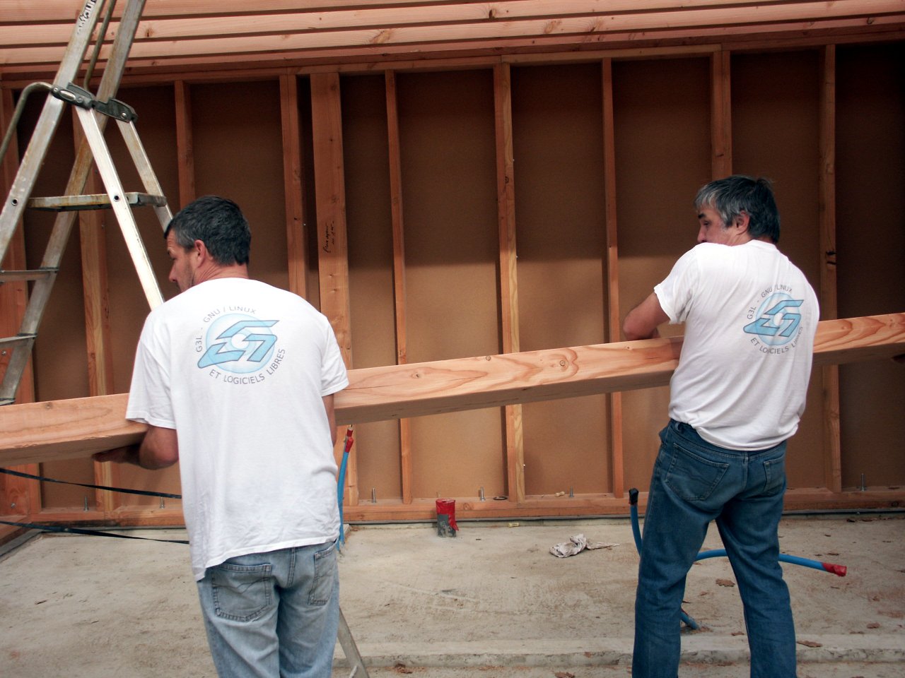 Deux personnes ont été invitées à construire, en Drôme, une maison écolo (ossature bois, chauffage bois, tuiles, murs... ). En auto-construction, pour éviter les grands groupes et faire des économies.
